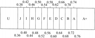 简单来说,语音传输指数是衡量语音传输质量的一个指标,该参数可以较为全面反映混响时间、信噪比和回声等对语言清晰度的影响,并且考虑了系统失真、心理声学效果(掩蔽效应)等因素。它的值范围为0~1,值越大说明清晰度越好。好的扩声系统即使用在声学条件较差的环境也能达到0.45到0.65的结果,而在声学环境较好的场所,能达到0.70至0.90。更直观的例子是,一间优秀的录音棚内,从麦克风到监听音箱之间典型的STI值能达到0.90至0.97。图1所示为评定等级,图中字母为等级名称,上面数字代表该等级的STI中心值,下面数字代表该等级的STI边界值。A+是极高的语言可懂度,A、B和C是高的语言可懂度,D是较好的语言可懂度,E是高品质的扩声系统,F是较好品质的扩声系统,G是语音报警系统的目标值,H是语音报警系统的正常下限,I是有限的语言可懂度,J和U是STI值太低,不宜用于扩声系统。